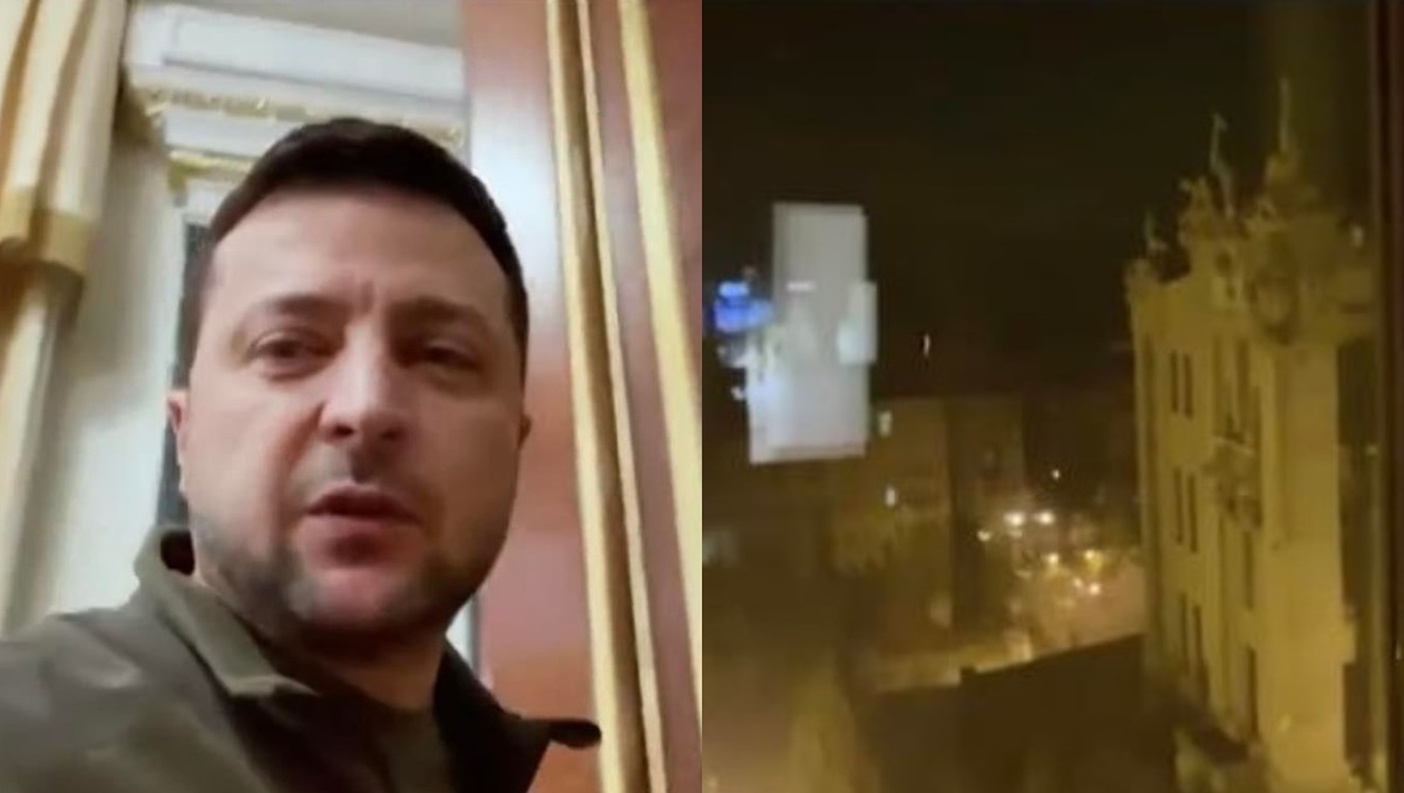 Liderul ucrainean și-a îndreptat sfidător camera pe fereastră, arătând că la Kiev era noapte, apoi a făcut observații din biroul său. Volodimir a avertizat, de asemenea, că alți membri NATO ar putea fi următorii dacă Rusia va reuși să acapareze Ucraina, spunând că Rusia va dori ”din ce în ce mai mult”.