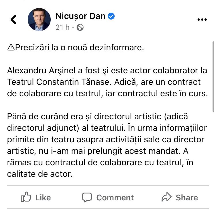 Însă, se pare că marele actor nu a fost dat afară din Teatrul de Revistă „Constantin Tănase”, ci doar nu i s-a mai prelungit mandatul de director, Alexandru Arșinel fiind în continuare actor colaborator al acestei instituții culturale. Dovadă stând postarea făcută chiar de primarul Capitalei, Nicușor Dan.