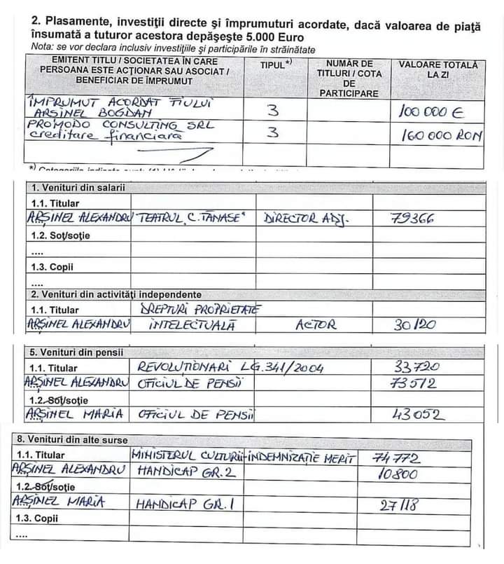 Astfel,  Alexandru Arșinel ar avea mai multe surse de venit, printre care salariu în cuantum de 79.366 lei de la Teatrul de Revistă „Constantin Tănase” pentru funcția de director adjunct și 30.120 lei din drepturile de proprietate intelectuală. Dar și veniturile provenite din pensii:  de revoluționar – 33.720, pensie normală – 73.512 lei, iar cea de handicap grad 2 – 10.800 lei.