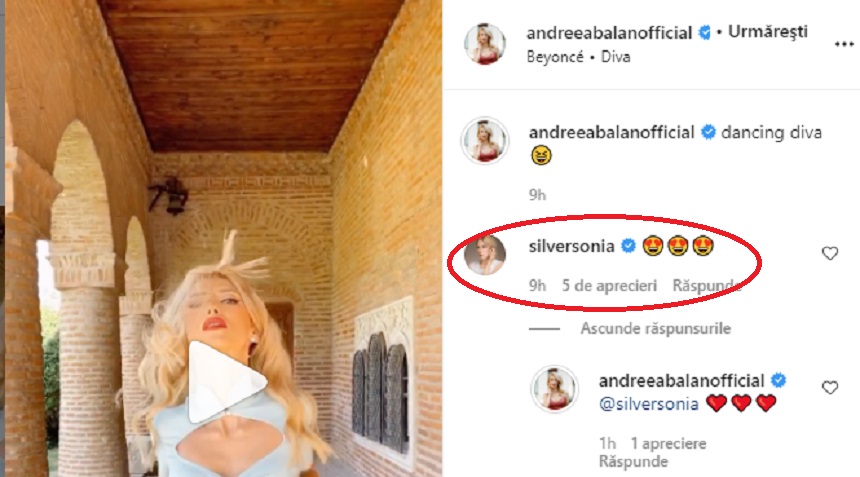 Nimeni alta decât Sonia Argint, sora lui Tiberiu Argint, i-a comentat Andreei Bălan cu câteva inimioare, pesemne că cele două se înțeleg foarte bine, iar relația Andreei cu familia iubitului său este fix așa cum trebuie să fie. După ce a văzut comentariul de la „cumnata” sa, Andreea Bălan i-a comentat și ea, la rândul ei, tot cu inimioare.