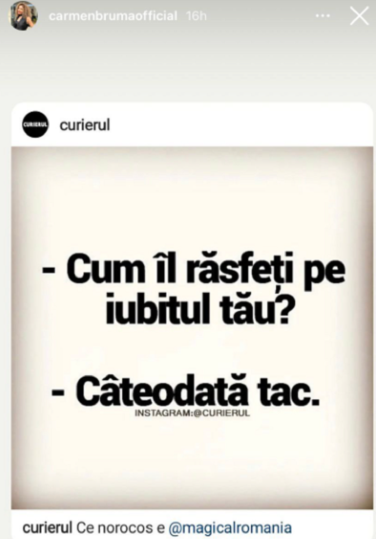 Este cunoscută teoria cum că femeile vorbesc mult mai mult ca bărbații, iar câteva minute de tăcere din partea iubitei par să fie apreciate de majoritatea bărbaților. Carmen Bruma știe cum să păstreze echilibrul în relația cu Mircea Badea și dacă un act nu stă în calea fericirii celor doi, se pare că lucrurile sunt mai simple decât credea oricine: ”Cum îl răsfeți pe iubitul tău? Câteodată tac.”, au fost vorbele din fotografia pe care Carmen Brumă a distribuit-o pe Instagram.