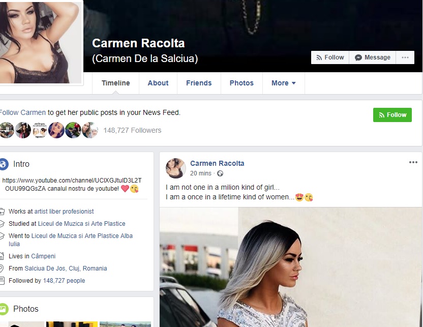 ”Nu sunt o fată dintr-un milion. Sunt o femeie pe care o întâlnești o dată în viață.”, a scris Carmen de la Sălciua pe contul ei de Facebook.