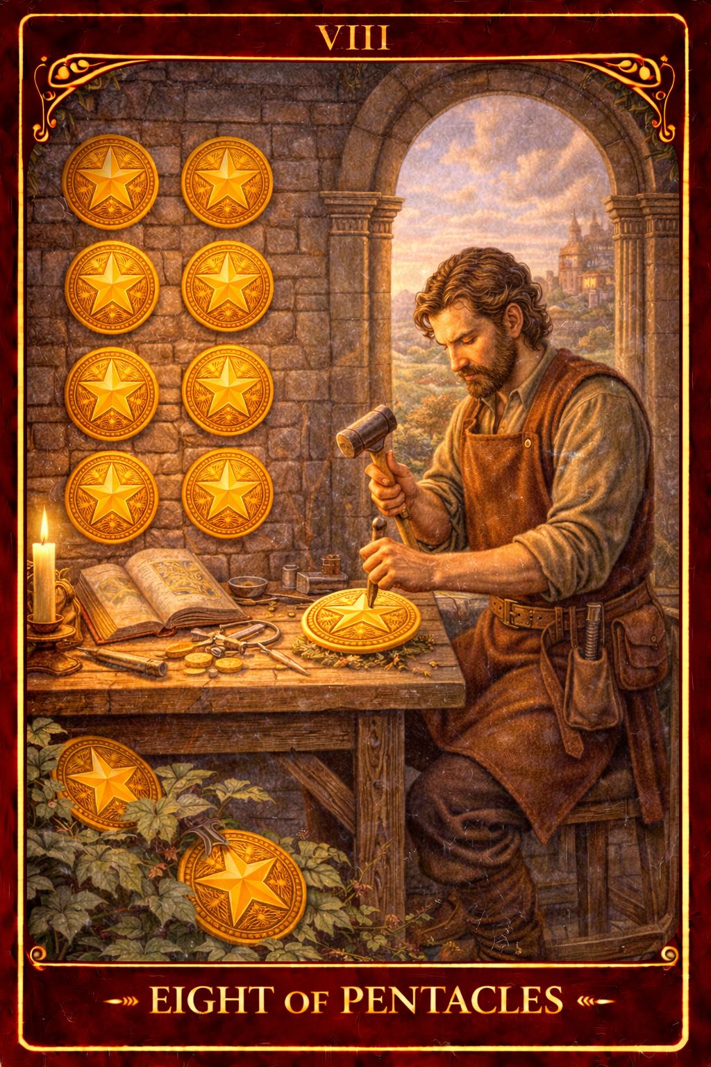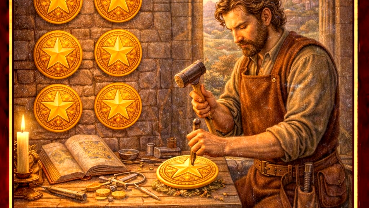 Imaginea cărții înfățișează o persoană concentrată asupra muncii sale, șlefuind cu atenție fiecare monedă. Fiecare pentagramă reprezintă un aspect al vieții materiale: carieră, bani, stabilitate, sănătate. Atenția la detalii și seriozitatea cu care este tratată munca transmit un mesaj clar: excelența vine din dedicare.