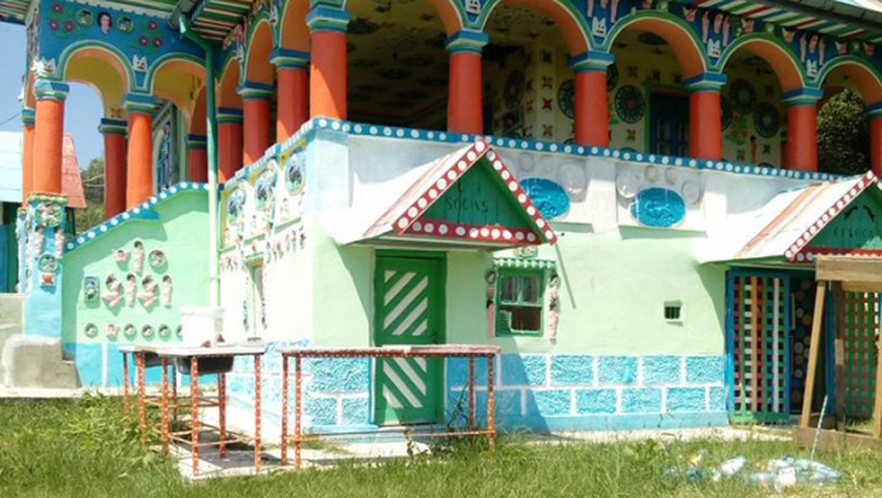 Omul, acum pensionar, a început încă din tinereţe să picteze casa bucată cu bucată. Mai întâi a colorat florile de pe tavan şi apoi a început să facă feţele păpuşilor din ipsos, pe care le-a aplicat deasupra geamurilor. În casa ce arată ca scoasă dintr-un basm nu locuieşte nimeni. Bărbatul stă în Bucureşti şi vine aici numai ca să mai picteze puţin casa, să aibă grijă de florile din curte şi să se relaxeze respirând aer curat.