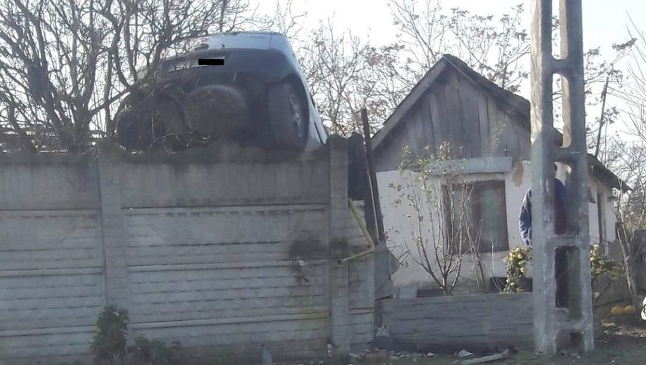Cascadorie într-o localitate din Dolj. Un șofer băut și fără permis s-a urcat cu maşina pe gardul unei locuinţe