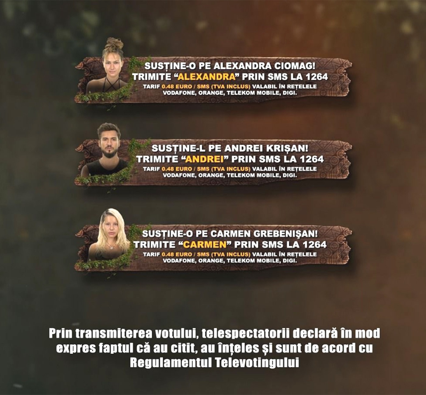 UPDATE ora 22:30 | Liniile de vot sunt deschise și pe durata pauzei de publicitate. Telespectatorii pot vota concurentul preferat. În prima etapă a sesiunii de vot, trebuie să salveze de la eliminare unul dintre cei doi concurenți: Dan Ursa sau Carmen Grebenișan.