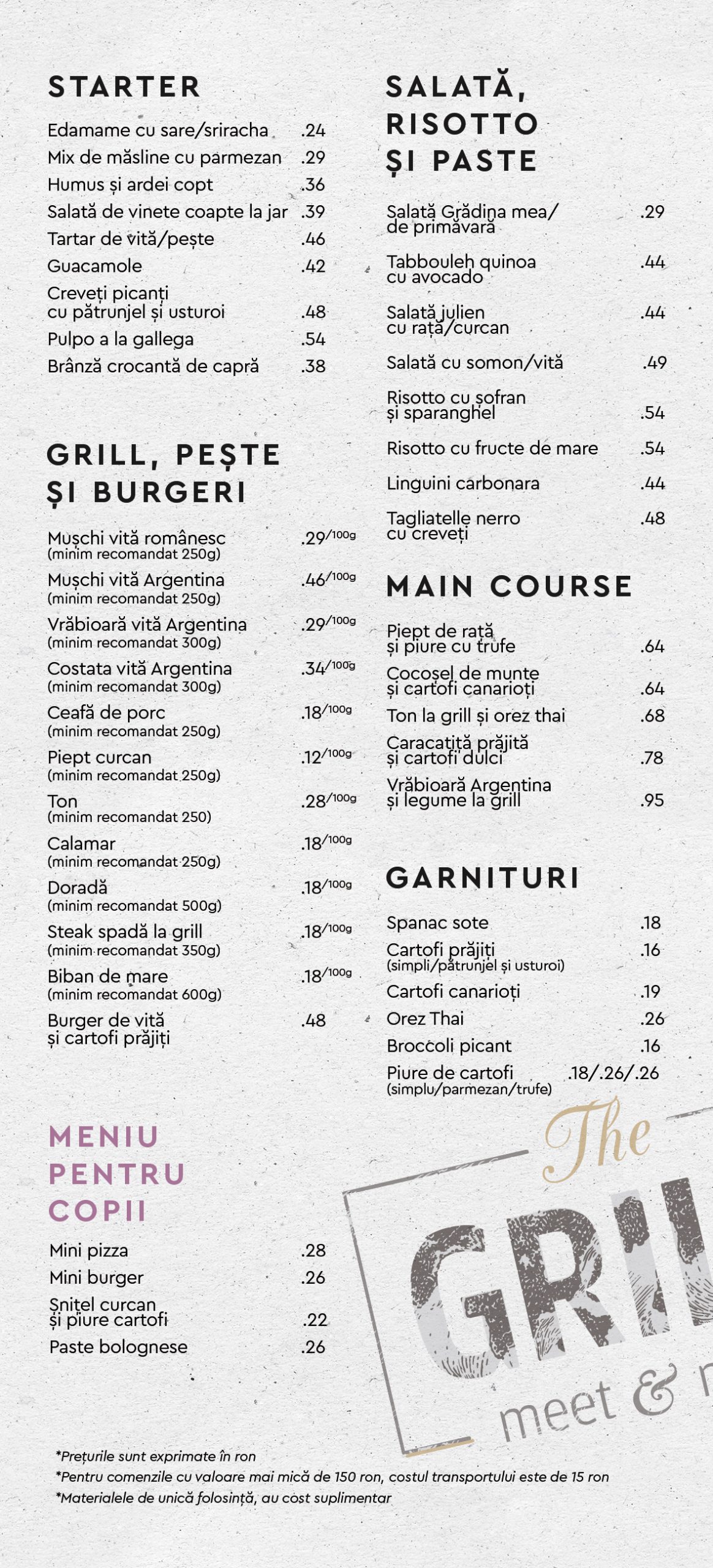 Pentru o friptură, oamenii trebuie să scoată din buzunar între 36 și 88 de lei, pentru o porție de 200 de grame, la care se mai adaugă, separat, o garnitură și chiar o salată, ambele plătite separat. De asemenea, o farfurie de ton sau dorada la grătar și o garnitură de piure costă aproximativ 60 de lei. Aperitivele pornesc de la 24 de lei și ajung chiar la 54 de lei și conțin diverse combinații delicioase de creveți, brânzeturi mixte, salate de tot felul tip garnitură.