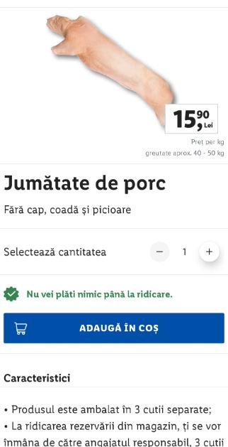 ”Produsul este ambalat în 3 cutii separate, iar la ridicarea rezervării din magazin, clienților li se vor înmâna de către angajator 3 cutii marcate distinct, numerotate cu 1, 2 și 3. Prețul de vânzare final pentru jumătatea de porc va fi determinată și achitată la momentul achiziției în magazin.