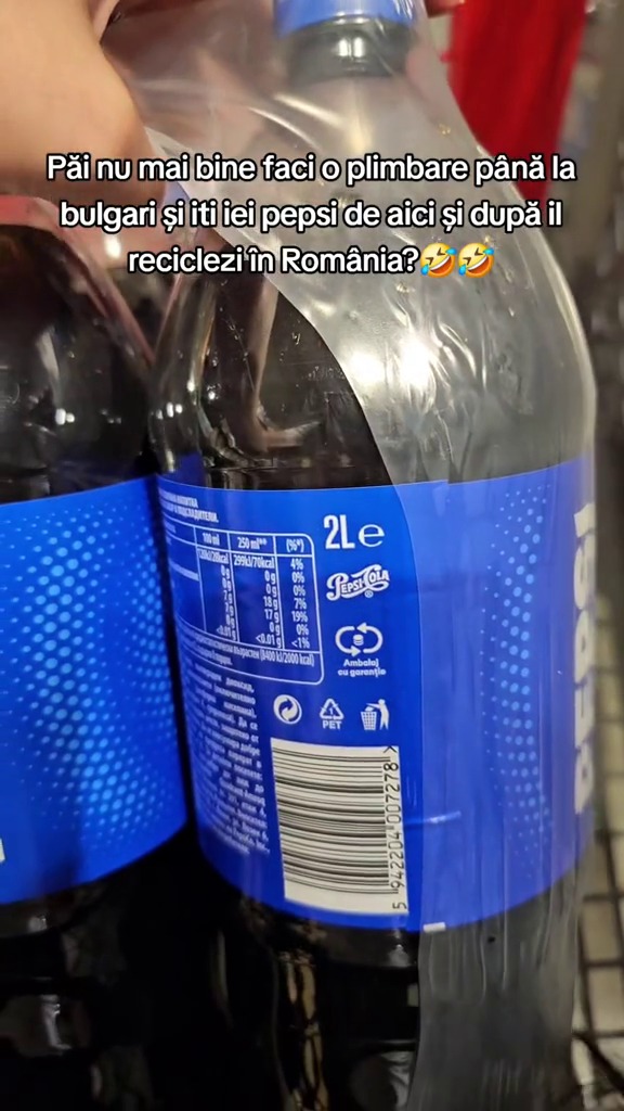 „Am găsit la bulgari Pepsi cu 2,9 leva, adică 5,35 lei și uitați ce scrie aici «ambalaj cu garanție». Adică sticla este românească și în România plătești 10 lei și ceva pe ea și aici plătești 5,35 lei”, a spus românca, într-un clip postat pe TikTok.