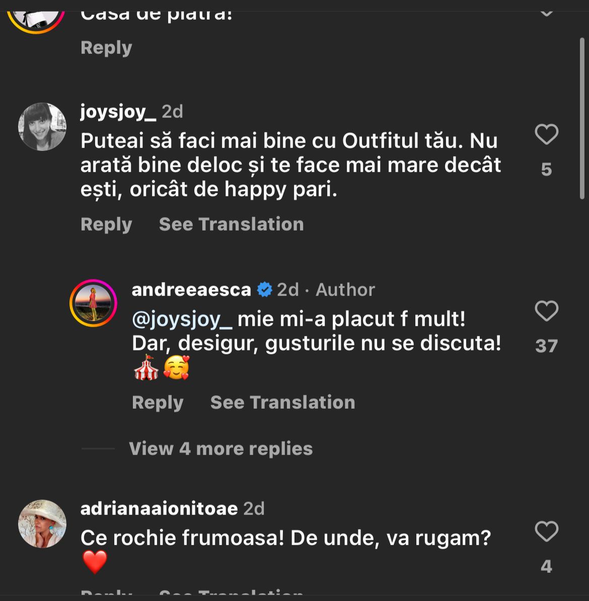 Cel din urmă comentariu – la care a și reacționat – i-a atras atenția Andreei Esca : ”Mie mi-a plăcut foarte mult. Dar, desigur, gusturile nu se discută”, a fost comentariul ei.