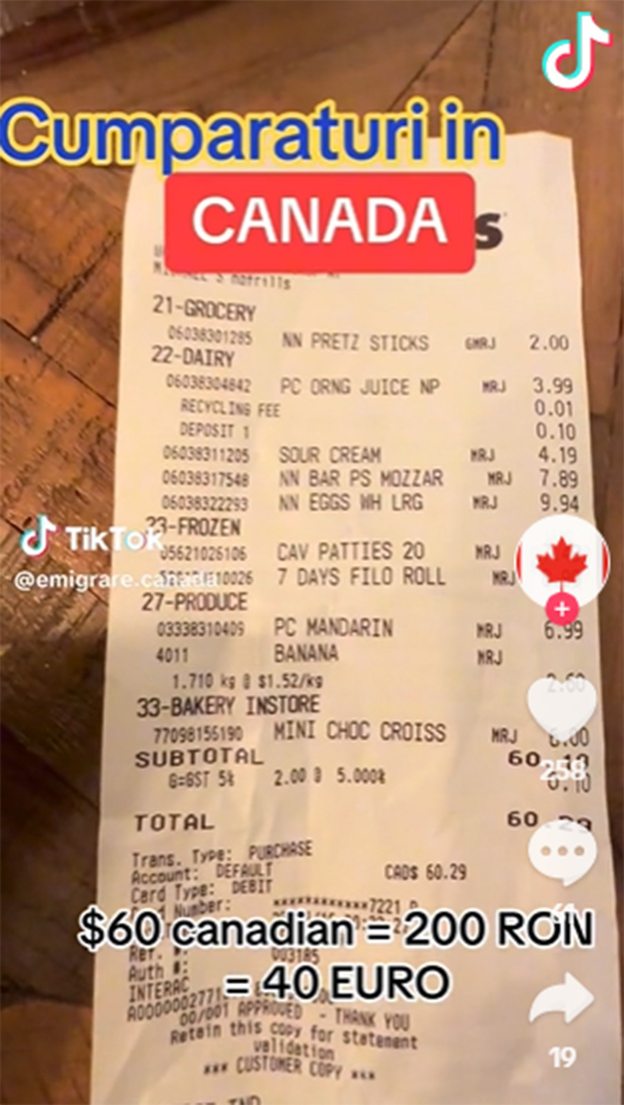Într-un clip postat pe platforma TikTok, românca și-a prezentat coșul de cumpărături. Aceasta a mers la magazin și a achiziționat câteva produse, cheltuind un total de 60 de dolari, adică echivalentul a aproximativ 200 de lei.