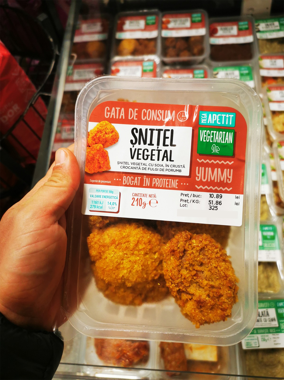 Una dintre opțiunile des întâlnite în magazine este șnițelul vegetal, un produs popular printre cei care țin post, dar și printre vegetarieni. În lanțurile de supermarketuri precum Mega Image, acest produs este disponibil sub diferite forme și ambalaje, iar prețul său atrage atenția. Spre exemplu, o cutie de 210 grame de șnițel de soia în crustă de porumb are un preț de aproximativ 11 lei, ceea ce înseamnă că, raportat la kilogram, costul ajunge la aproape 52 de lei.