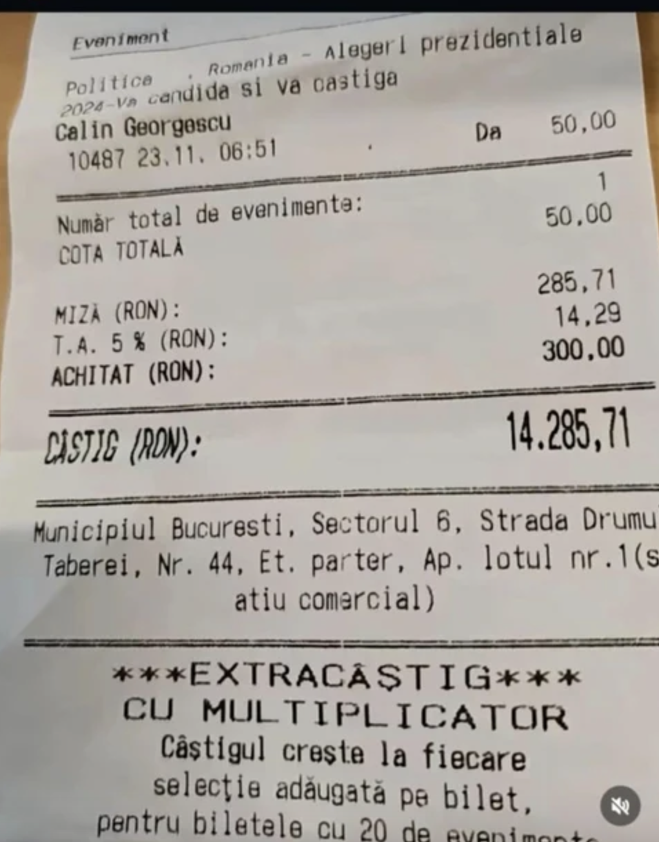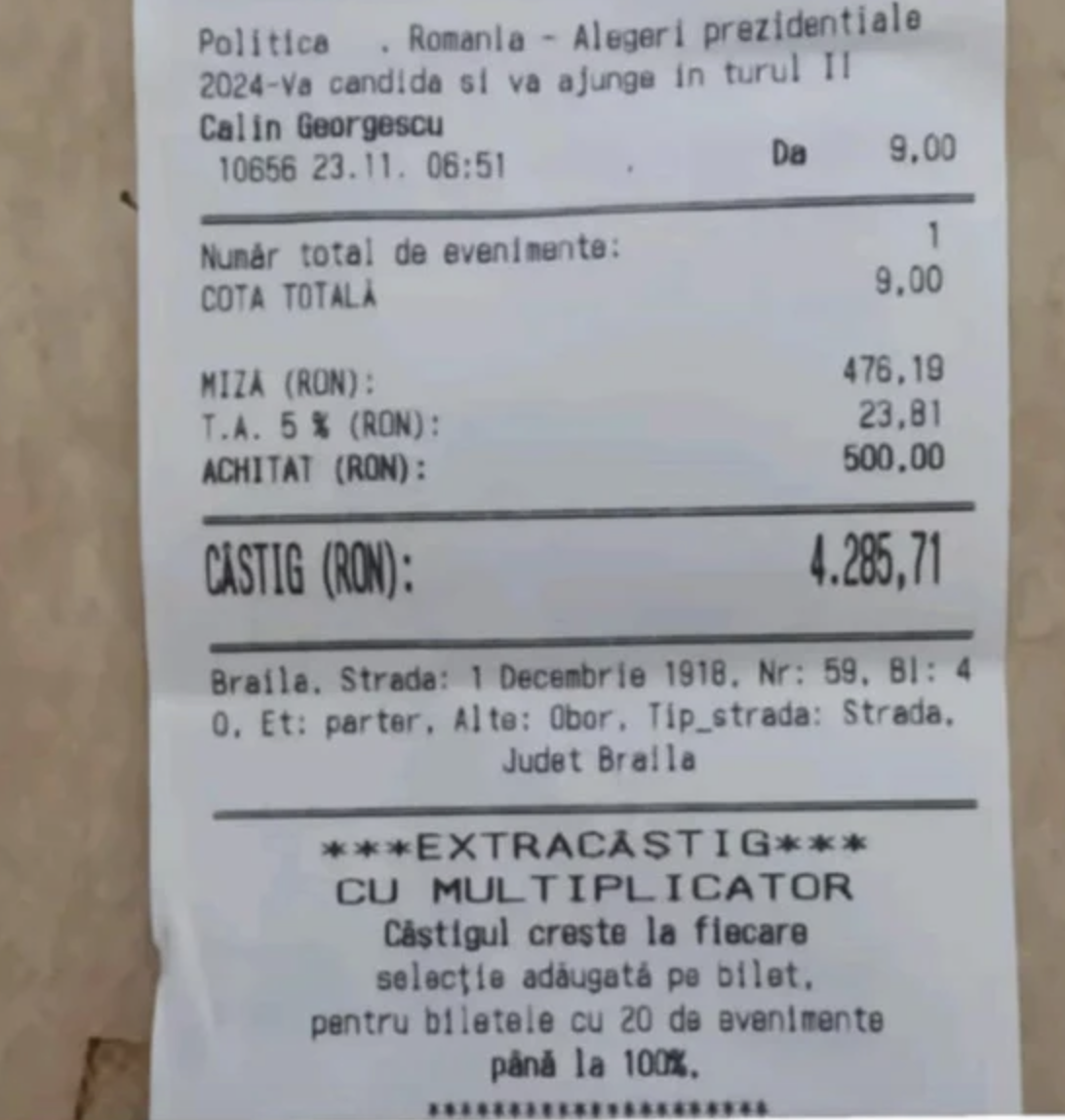 TikTok a avut un rol important în această mobilizare, transformând campania lui Georgescu într-un adevărat eveniment viral. Tot pe această platformă, au apărut în ultimele ore dovezi despre legătura surprinzătoare dintre susținătorii săi și lumea pariorilor sportivi. Se pare că aceștia nu doar că au votat, dar au mizat efectiv pe victoria lui Georgescu în turul I, plasând pariuri la cote spectaculoase. Această situație inedită a atras atenția, mai ales că nici casele de pariuri nu au anticipat o asemenea răsturnare de situație.