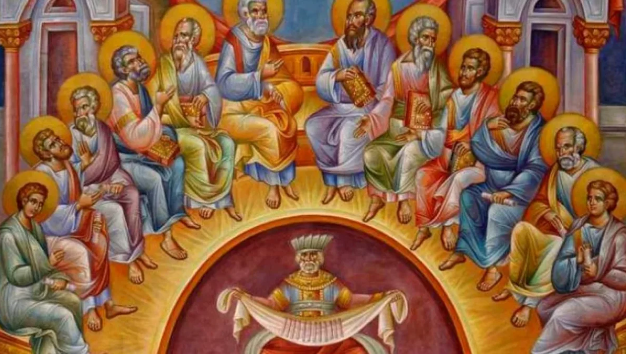 „În zilele acelea, când a sosit ziua Cincizecimii, Apostolii erau toți împreună în același loc. Și din cer, fără de veste, s-a făcut un vuiet, ca de suflare de vânt ce vine repede, și a umplut toată casa unde ședeau ei. Și li s-au arătat, împărțite, limbi ca de foc și au șezut pe fiecare dintre ei. Și s-au umplut toți de Duhul Sfânt și au început să vorbească în alte limbi, precum le dădea lor Duhul a grăi. Și erau în Ierusalim locuitori iudei, bărbați cucernici, din toate neamurile care sunt sub cer. Și, iscându-se vuietul acela, s-a adunat mulțimea și s-a tulburat, căci fiecare îi auzea pe ei vorbind în limba sa”.