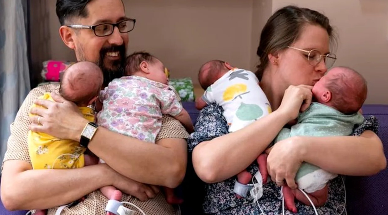 Un cuplu din Statele Unite ale Americii trăiește o adevărată minune, după ce Rachel Vargas a adus pe lume patru fetițe identice, un fenomen incredibil de rar, întâlnit o dată la 40.000.000 de cazuri. Acum, proaspeții părinți se pregătesc să plece acasă alături de cele patru micuțe, după o lungă perioadă petrecută în secția de terapie intensivă neonatală. Rachel a primit vestea neașteptată în timpul unei ecografii de rutină, când medicul a atins-o pe umăr și i-a spus cu blândețe.