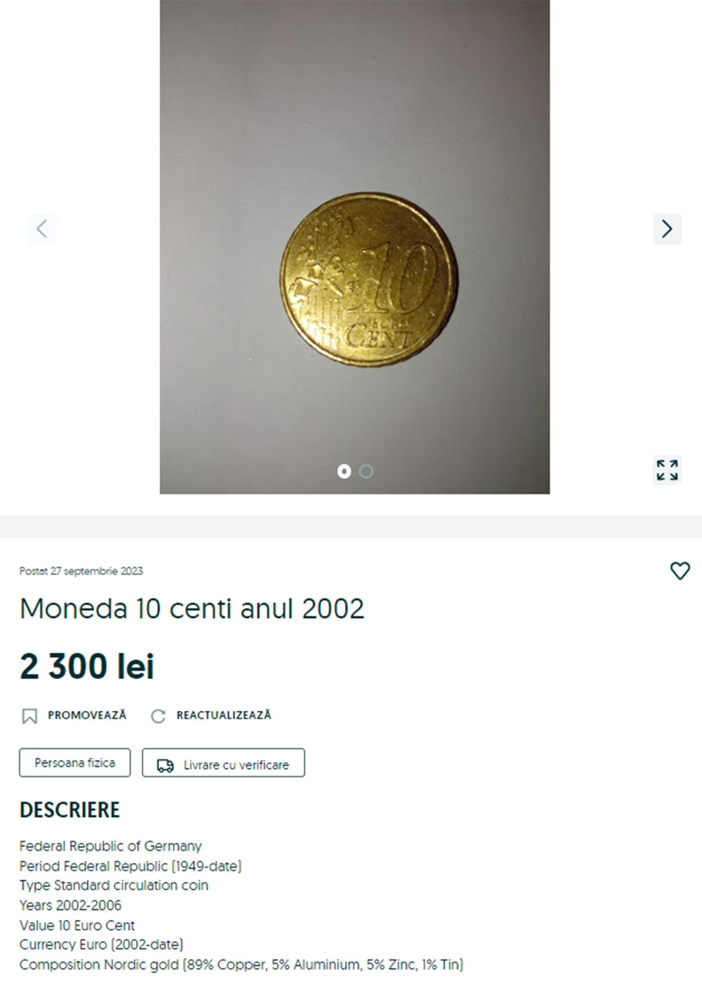 De exemplu, în urmă cu doar câteva zile, o monedă din anul 2002 a fost scoasă la vânzare în mediul online. Este vorba de moneda de 10 cenți, care deși pentru unii poate să pară doar un bănuț vechi, fără valoare, pentru alții reprezintă o adevărată comoară.
