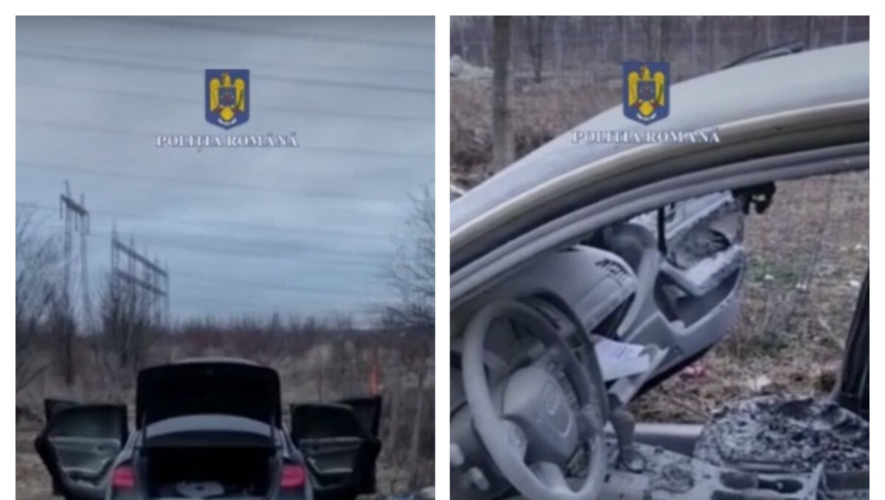 Mașina care a fost incendiată/ foto: Facebook Poliția Română