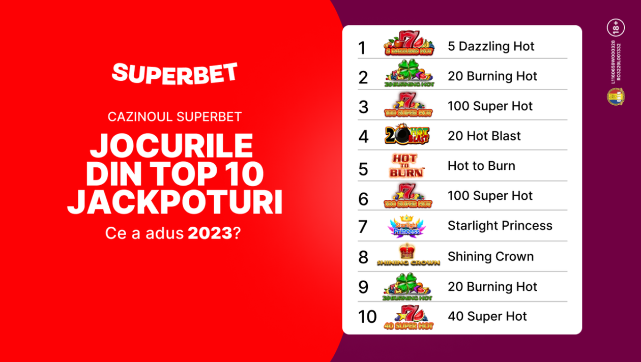 2023 a fost un an care, în cazinoul Superbet, a adus o mulțime de jocuri noi, unele dintre ele exclusive, dar și surprize pentru norocoși. S-au câștigat, în cele 12 luni, 11 jackpoturi cu valoare mai mare de un milion de lei. Află care sunt sloturile care au făcut cei mai mulți români fericiți și care este cel mai mare jackpot lovit anul trecut la Superbet, din rândurile următoare.