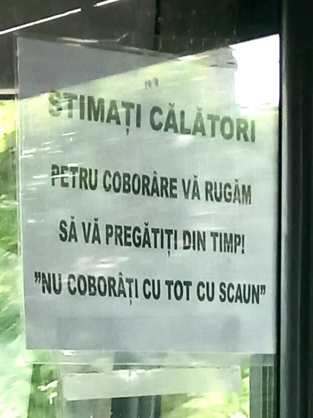 PENTRU COBORÂRE VĂ RUGĂM SĂ VĂ PREGĂTIȚI DIN TIMP! NU COBORAȚI CU TOT CU SCAUN”, este mesajul care a stârnit râsetele călătorilor din Capitală.