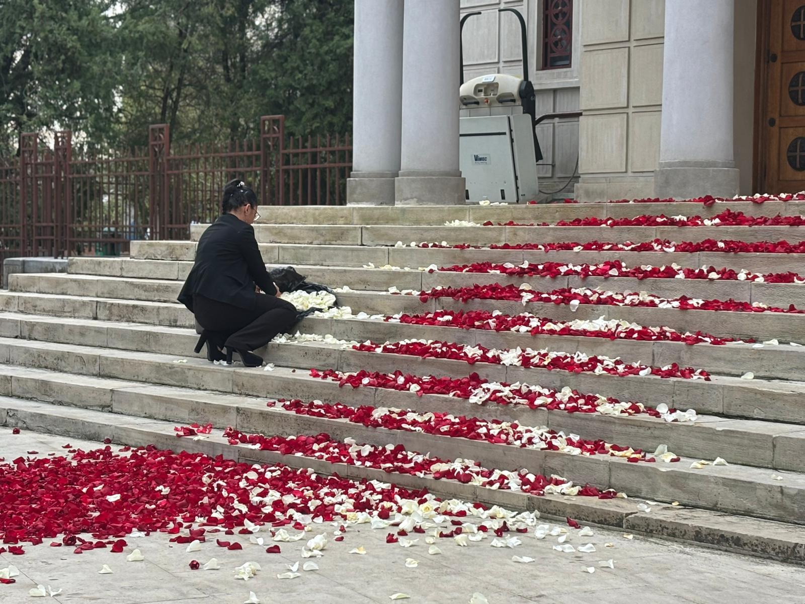 Petale de trandafiri pe treptele bisericii