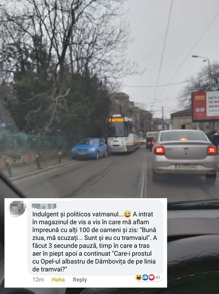 ”Indulgent și politicos vatmanul. A intrat în magazinul de vis-a-vis în care mă aflam împreună cu alți 100 de oameni și a zis: ”Bună ziua, mă scuzați, sunt și eu cu tramvaiul”. A făcut 3 secunde pauză, timp în care a tras aer în piept, apoi a continuat. ”Care-i prostul cu Opel-ul albastru de Dâmbovița de pe linia de tramvai?”, a fost mesajul postat în dreptul fotografiei postate în mediul online.