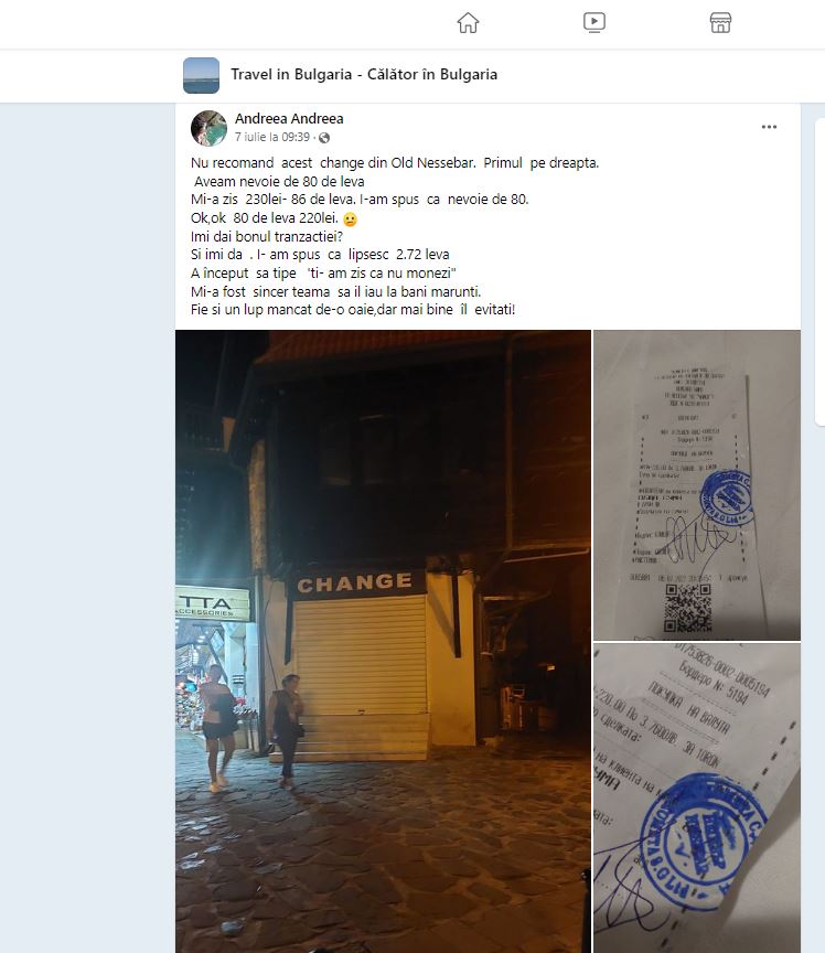 Femeia a mers la un exchange din Nessebar pentru a schimba 80 de leva, însă a avut parte de o experienţă neplăcută. Mai exact, pe o pagina de Facebook destinată turiştilor care vor să călătorească în Bulgaria, aceasta a povestit faptul că a fost păcălită în timpul tranzacţiei.