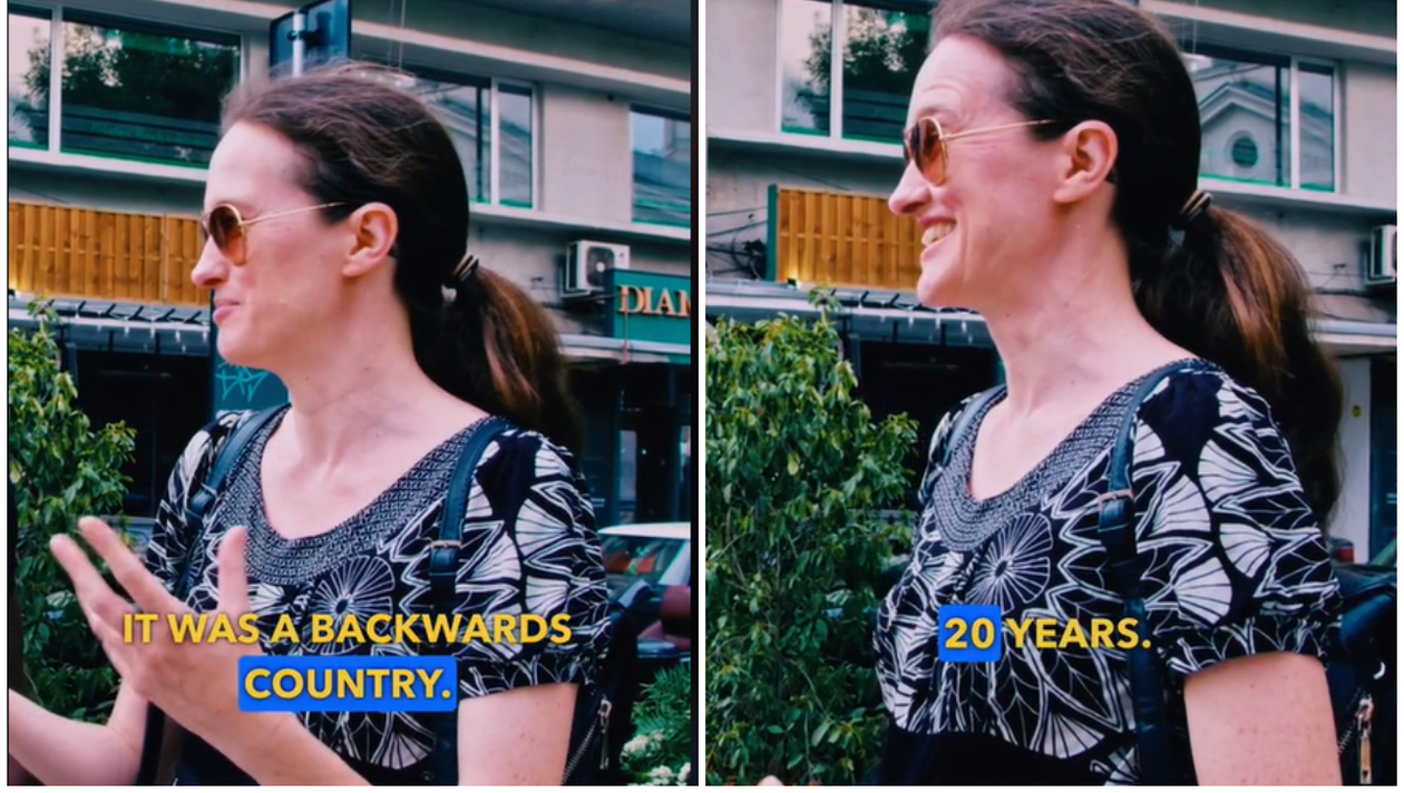 O femeie din Marea Britanie și-a lăsat țara unde s-a născut și a plecat peste hotare, de ani buni. Locuiește în România de două decenii și nu mai vrea să plece. Când a părăsit UK, mama ei i-a dat două cutii cu supă, în cazul în care n-ar fi găsit mâncare. Englezoaica avea impresia că suntem o țară înapoiată, săracă și plină de câini abandonați. Și-a dat seama, cu timpul, că este un loc minunat. De atunci, n-a mai vrut să plece. Acum, vorbește română și este îndrăgostită până peste cap de cultura noastră. Nu s-ar mai întoarce niciodată în Anglia, pentru că țara ei „dă înapoi”, nicidecum înainte.