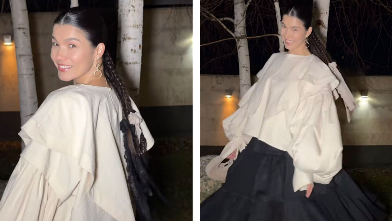 Cunoscută pentru stilul său personalizat, inspirat din tradițiile locale, Ileana a surprins printr-o alegere vestimentară neobișnuită pentru un astfel de eveniment. A optat pentru o rochie alb-negru, largă, cu mâneci bufante, care aducea aminte de straiele tradiționale, dar într-o versiune modernă. Detalii precum cozile împletite, balerinii în stilul opincilor și ciorapii cu aspect de lână au adus un aer rustic, dar elegant. Geanta gri a completat perfect ținuta, aducând un strop de rafinament.