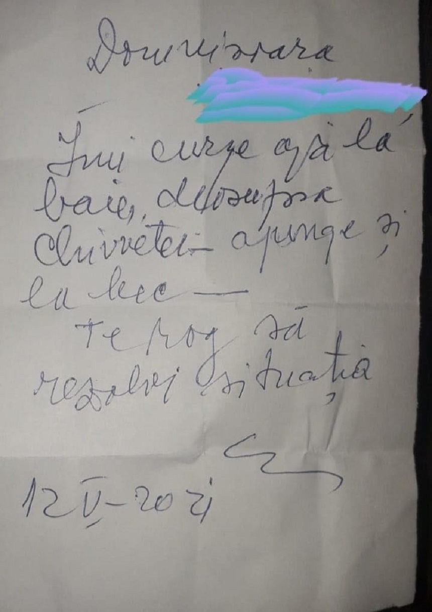 „Ieri mi s a plans vecinul de sub mn astfel (in imagine este biletul ce mi l lasase in usa). Initial am crezut ca exagereaza si ca doar ce vrea putina drama. In 2018 dupa ce se renovase in casa, inclusiv in baie (schimbat wc, gresie etc) a tinut sa ma acuze ca din cauza modificarilor facute la mn ii ,,pute” lui in baie. Au venit instalatorii, seful asociatiei de proprietari, 2 politisti… cu totii au constatat ca totul e bn si ca reclamatiile lui nu sunt fondate (ba chiar s a dovedit ulterior ca din cauza instalatiilor din baia dânsului ii mirosea lui urat). Urmasera cateva luni de liniste, dânsul si a modificat ceva la baie caci in vreo 3 sau 4 seri se auzeau voci in baia dânsului plus bormasina, dar nu stiu exact care e situatia exacta si daca ceea ce a facut a determinat ca in prezent chiar sa fie o probl si la mn. Aseara am observat ca plangerea lui, de data aceasta, este intemeiata.