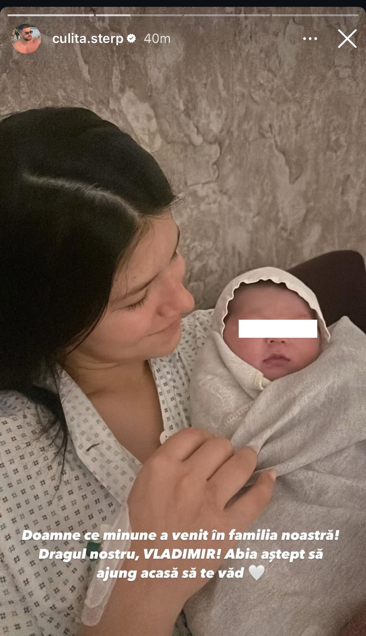 „Doamne, ce minune a venit în familia noastră! Dragul nostru, Vladimir! Abia aștept să ajung acasă să te văd”, a scris Culiță Sterp, în mediul online.
