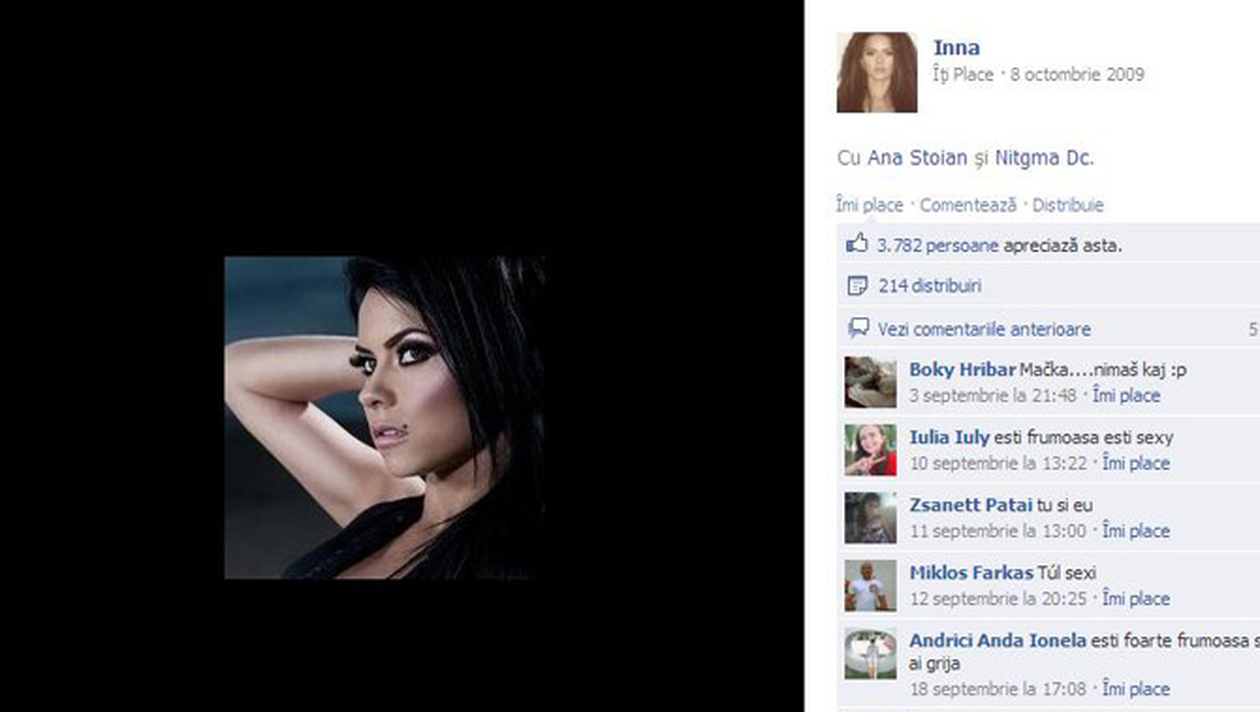 8 octombrie 2009. Inna a vrut ca prima poza sa fie una de pictorial, tocmai pentru a-si crea o imagine perfecta in fata admiratorilor ei virtuali. Tocmai pentru ca are milioane de fani, Inna are grija ca fiecare postare si fotografie sa fie fara cusur. Drept dovada, la aceasta postare a primit aproape 4000 de like-uri
