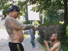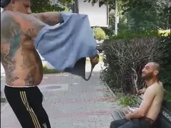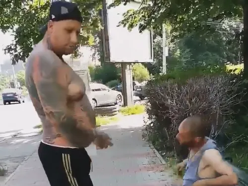 Fără să stea pe gânduri, bărbatul plin de tatuaje și de mușchi s-a așezat în fața cerșetorului care stătea liniștit pe o bancă și l-a privit preț de câteva secunde. Mai apoi, acesta și-a dat jos maioul pe care îl purta și i l-a făcut cadou cerșetorului, care l-a îmbrăcat imediat extrem de bucuros.