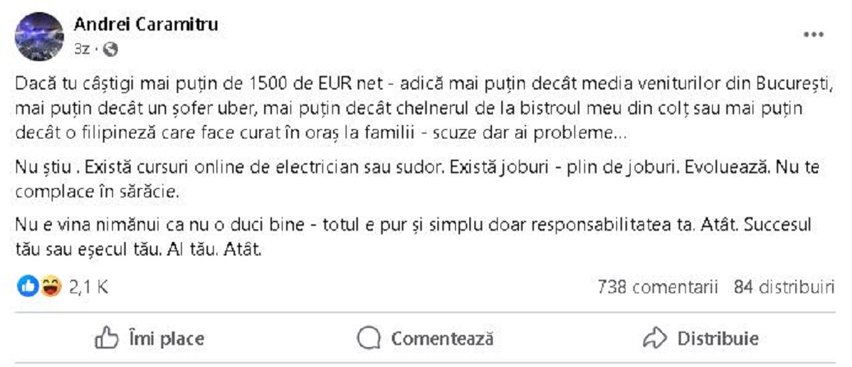 ”Dacă tu câștigi mai puțin de 1.500 de euro net – adică mai puțin decât media veniturilor din București, mai puțin decât un șofer de Uber, mai puțin decât chelnerul de la bistroul din colț sau mai puțin decât o filipineză care face curat în oraș la familii – scuze, dar ai o problemă. Există cursuri online de electrician sau sudor. Există joburi – plin de joburi. Evoluează. Nu te complace în sărăcie. Nu e vina nimănui că nu o duci bine – totul e pur și simplu doar responsabilitatea ta. Atât. Succesul tău sau eșecul tău. Al tău. Atât”, a scris economistul Andrei Caramitru într-o postare pe o rețea de socializare.