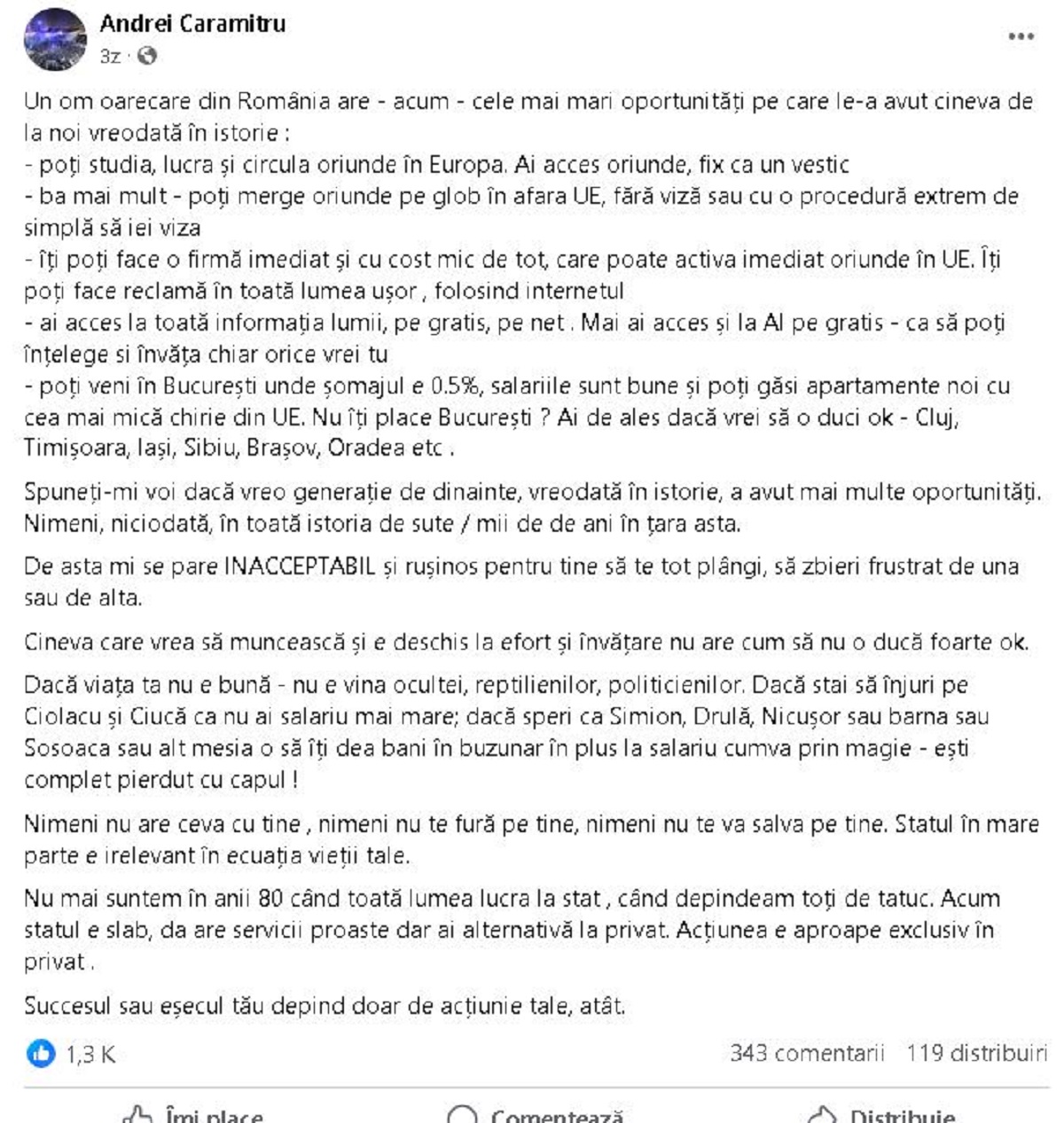 Nimeni nu are ceva cu tine, nimeni nu te fură pe tine, nimeni nu te va salva pe tine. Statul în mare parte e irelevant în ecuația vieții tale. Nu mai suntem în anii 80 când toată lumea lucra la stat, când depindeam toți de tătuc. Acum statul e slab, da are servicii proaste dar ai alternativă la privat. Acțiunea e aproape exclusiv în privat. Succesul sau eșecul tău depind doar de acțiunile tale, atât”, a scris Andrei Caramitru pe Facebook.