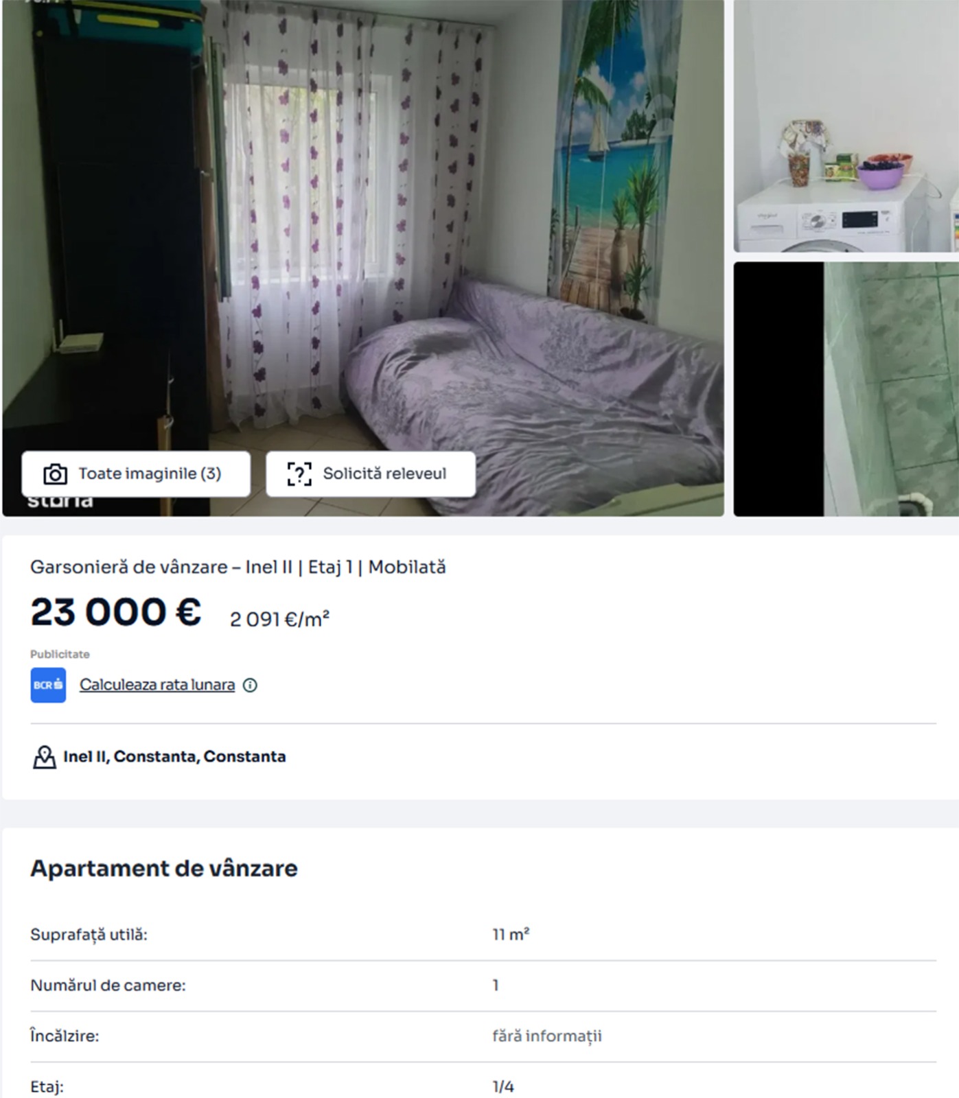 Prețul cerut pentru această garsonieră este de 23.000 de euro, ceea ce o transformă în cea mai ieftină opțiune disponibilă în Constanța la momentul analizei. Raportat la suprafață, costul ajunge la aproximativ 2.091 de euro pe metru pătrat, un nivel ridicat pentru un spațiu atât de mic, însă suma totală rămâne atractivă pentru segmentul low-budget.