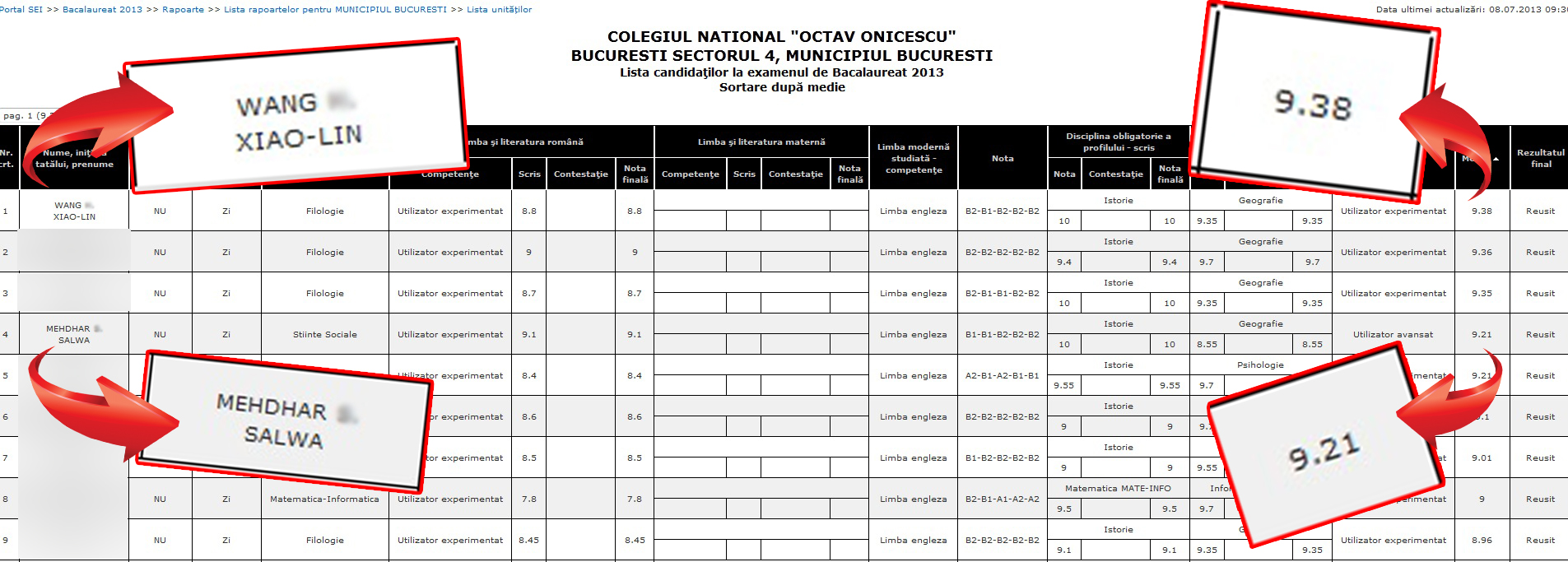 Colegiul National “Octav Onicescu” din sectorul 4 a furnizat o surpriza la afisarea rezultatelor de la bacalaureat: cea mai mare nota, 9.38, a obtinut-o o eleva nascuta tocmai la Bejing: Wang Xiao-Lin!