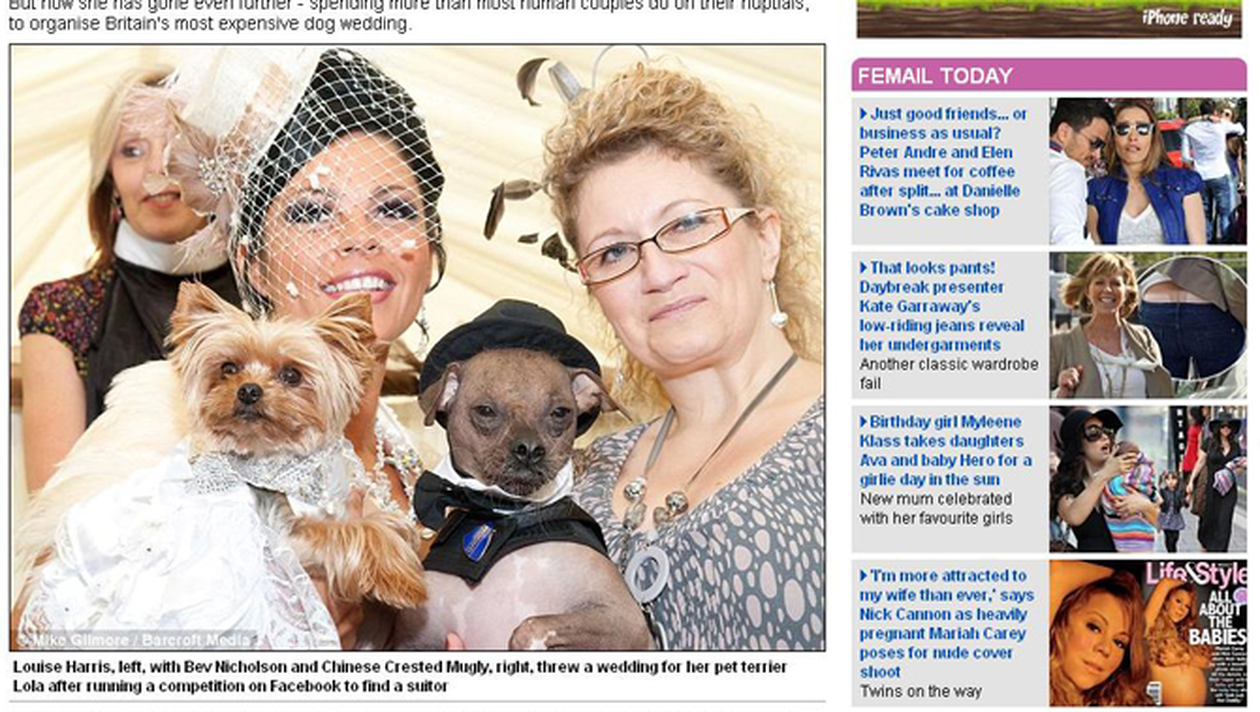 Nunta canina a costat nu mai putin de 20.000 de lire sterline. Louise Harris, proprietare miresei Lola, a invitat la nunta 80 de persoane. Lola s-a casatorit cu Mugly, acre detine titlul de cel ami urat caine din Marea Britanie, conform dailymail.co.uk.Cortul in care s-a desfasurat nunta a costat 2.500 de lire, florile circa 1.000 de lire, aranjamentele 3.000 de lire plus alte cheltuieli.