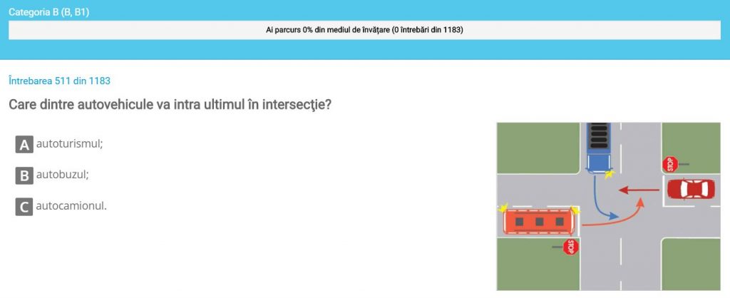 Imaginați-vă situația din poza de mai jos. Cine credeți va trece primul intesecția. Iată și cele trei variante grilă oferite de chestionarele auto.