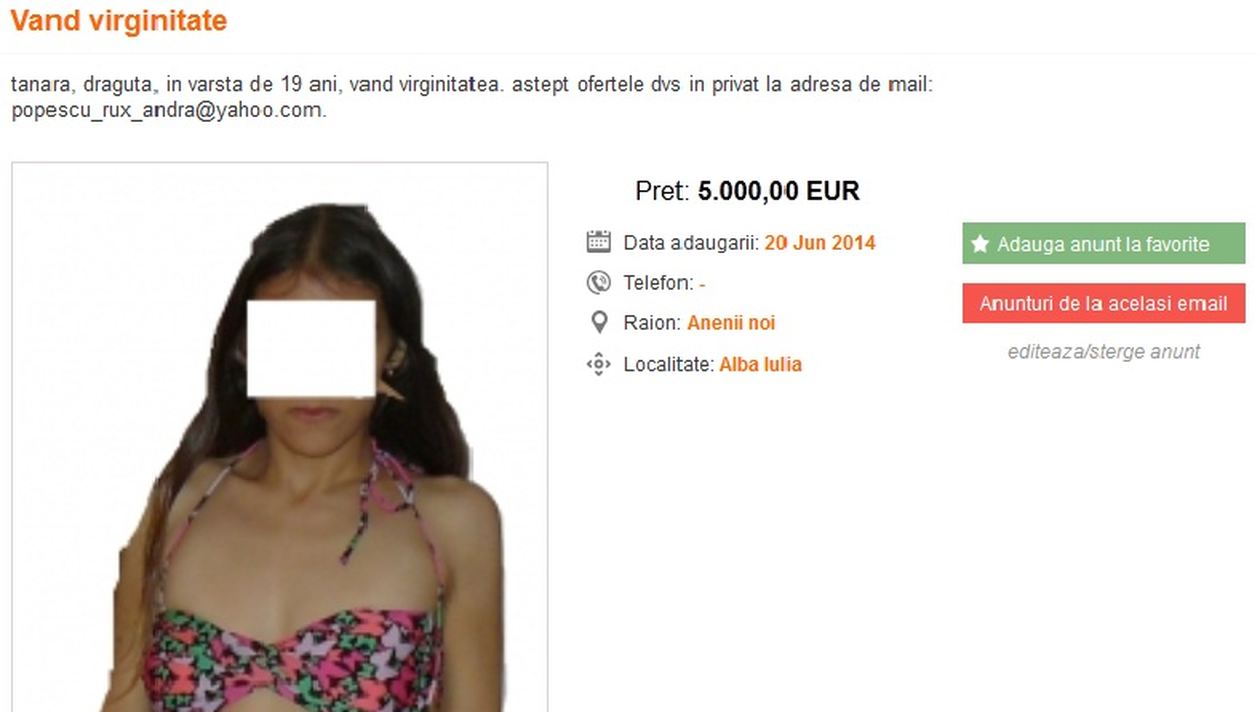 “Sunt o fata virgina in varsta de 20 de ani, curata, fara probleme de sanatate, doresc sa imi vand virginitatea unui domn cu situatie financiara buna. Astept ofertele voastre. Sunt de acord sa fiu verificata”.