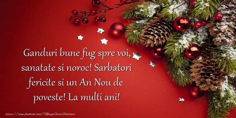 ”Anul nou bate la uşă, răul facă-se cenuşă, bucurii şi sănătate, Domnul să vă dea de toate, şi când nici nu vă gândiţi, să fiţi şi mai fericiţi! La Mulţi Ani!”
