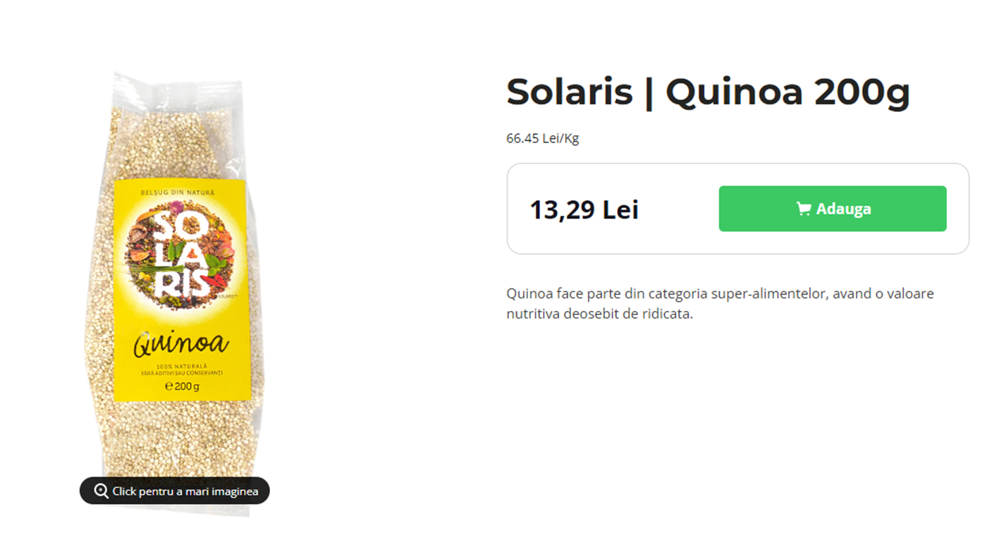 Quinoa poate fi găsită și la Mega Image, unde prețul său este de 13,29 pentru o pungă de 200 de grame. Prețul pe kilogram este de 66,45 de lei, de la distribuitorul Solaris.