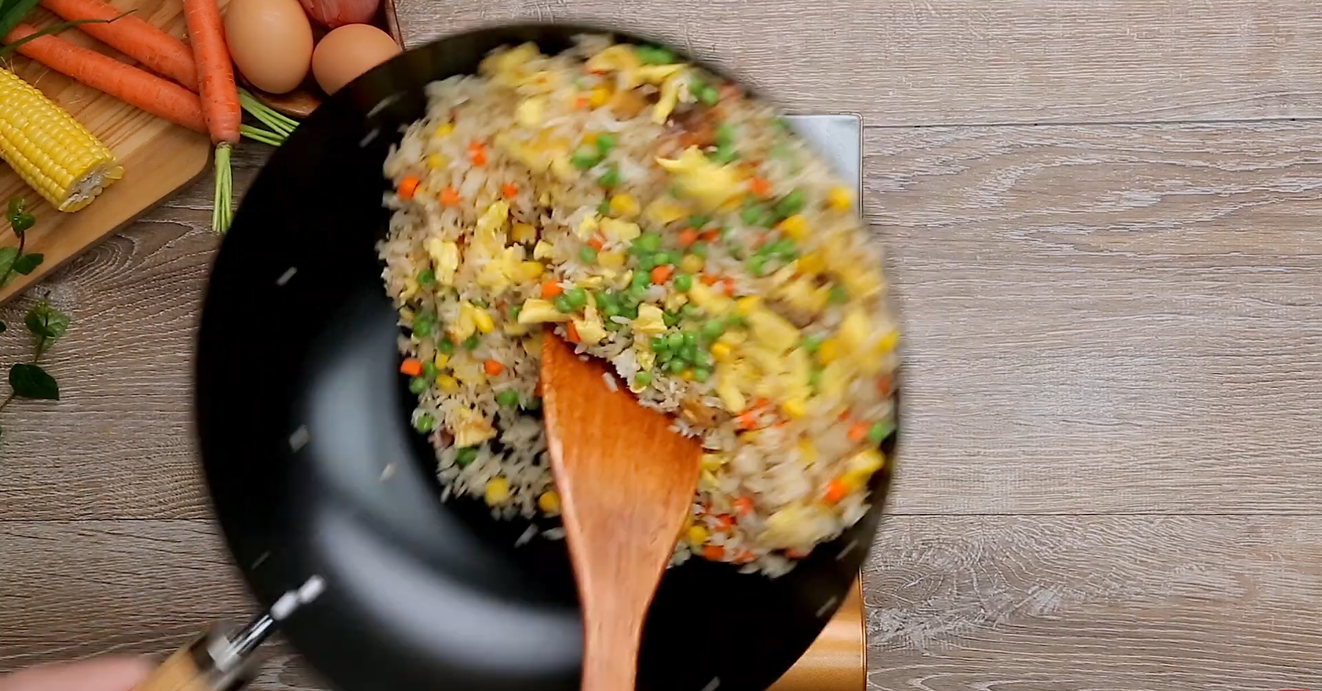 Încălziți wok-ul, adăugați ulei și gătiți ouăle aproximativ 30 de secunde. Adăugați orezul și amestecați continuu pentru a separa boabele.