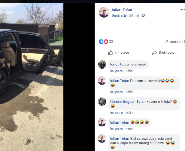 Ionuţ Tofan, îşi achiziţionase de curând un autoturism Audi, iar la prezentarea acestuia pe Facebook, un apropiat îl întreabă dacă este dispus să facă o ”liniuţă”, semn că întrecerile auto de pe şosea nu îi erau străine.