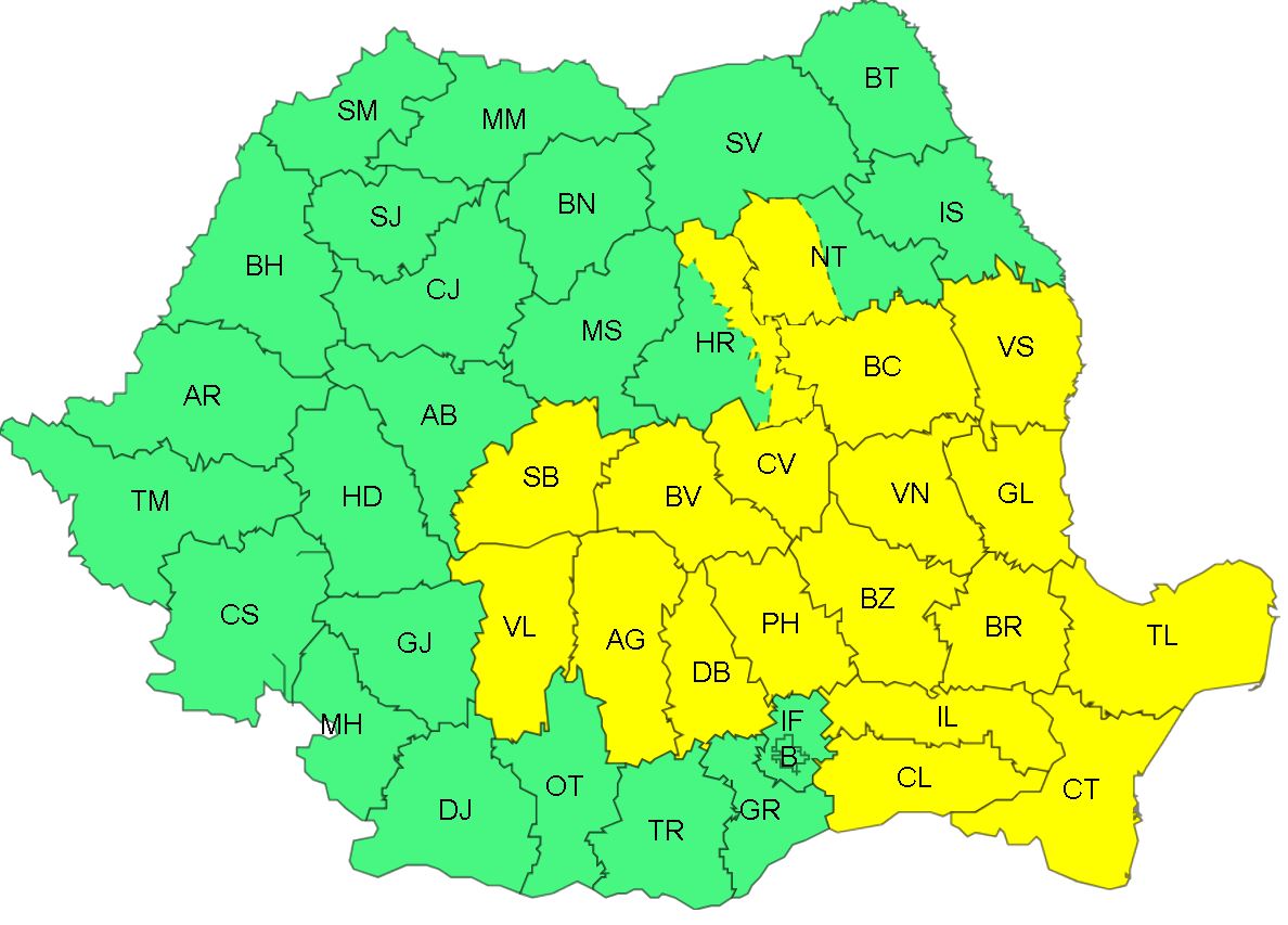 Tot o avertizare tip cod galben e valabilă și în intervalul 29 august, ora 10 – 29 august, ora 23, iar fenomenele vizate sunt instabilitate atmosferică și cantități însemnate de apă. Sunt vizate Dobrogea, jumătatea de sud a Moldovei, sudul Transilvaniei, nordul și estul Munteniei, nord-estul Olteniei, local în Carpații Orientali și Meridionali.