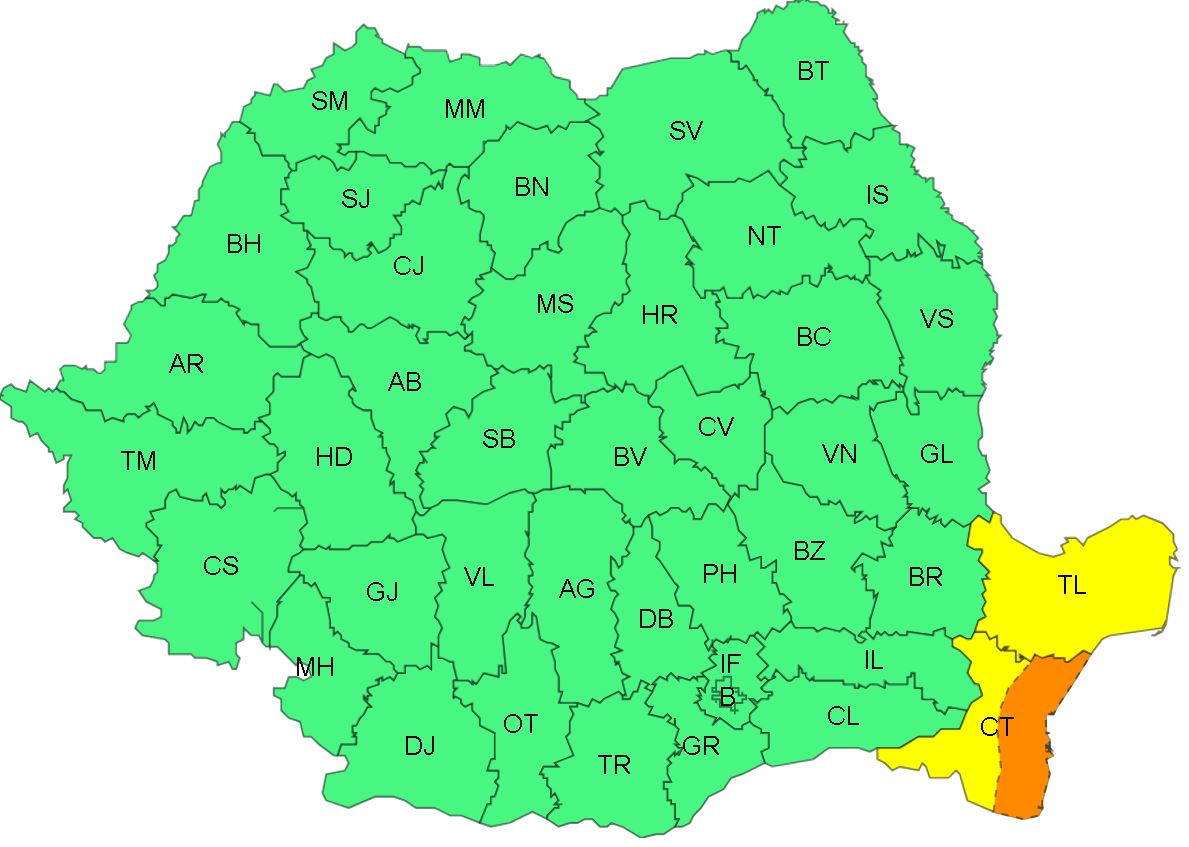 Potrivit ANM, în intervalul 29 august, ora 23 – 30 august, ora 10, este activă o avertizare de tipul Cod portocaliu de furtuni, valabilă pentru zona litorală a județului Constanța.