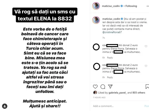 “Vă rog să dați un sms cu textul ELENA la 8832. * Este vorba de o fetiță bolnavă de cancer care face chimioterapie și câteva operații în Turcia chiar acum. Simt eu că se va face bine. Misiunea mea este s-o țin acolo să se trateze. Va rog sa mă ajutați sa fac asta căci altfel vă voi stresa îngrozitor până sau o faceți sau îmi dați unfollow. Mulțumesc anticipat”, a scris Codin Maticiuc pe contul lui de Instagram. Astăzi, el a publicat un nou mesaj, după cum puteți vedea în galeria foto a articolului.