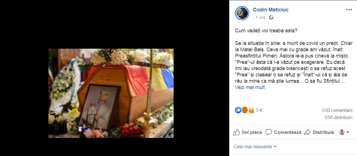 Se ia situația în sine: a murit de covid un preot. Chiar la Matei Balș. Ceva mai cu grade am văzut, Înalt Preasfintitul Pimen. Ăstora le-a pus cineva la mișto „Prea”-ul ăsta că i-a văzut pe exagerare. Eu dacă îmi iau vreodată grade bisericești o sa refuz acest „Prea” și claaaar o sa refuz și „Înalt”-ul că și ăla da rău la mine ca mă știe lumea… O sa fiu Sfințitul Codin. Sau Fericitul Codin, stai, asta sunt deja. În fine, hai ca am luat-o prin aratura. Deci a murit omul și i s-a aprobat mare înmormântare cu pelerinaj de mii de oameni. Pâi e corect așa, bossilor?