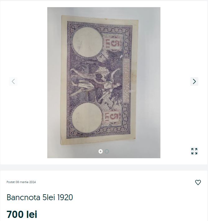 Pe rețelele de socializare, pe diverse platforme comerciale, dar și de specialitate apar către vânzare bancnote și monede vechi. De data aceasta, în atențe se află o bancnotă de 5 lei din anul 1920. Potrivit unuia dintre anunțurile care apar pe internet, aceasta se află într-o stare bună. Un utilizator cere pentru o asemenea bancnotă suma de 700 de lei. Oferă livrare cu verificare. Iată mesajul notat de utilizator, în anunțul respectiv: „În stare bună, fără rupturi, foarte puțin pătată”.
