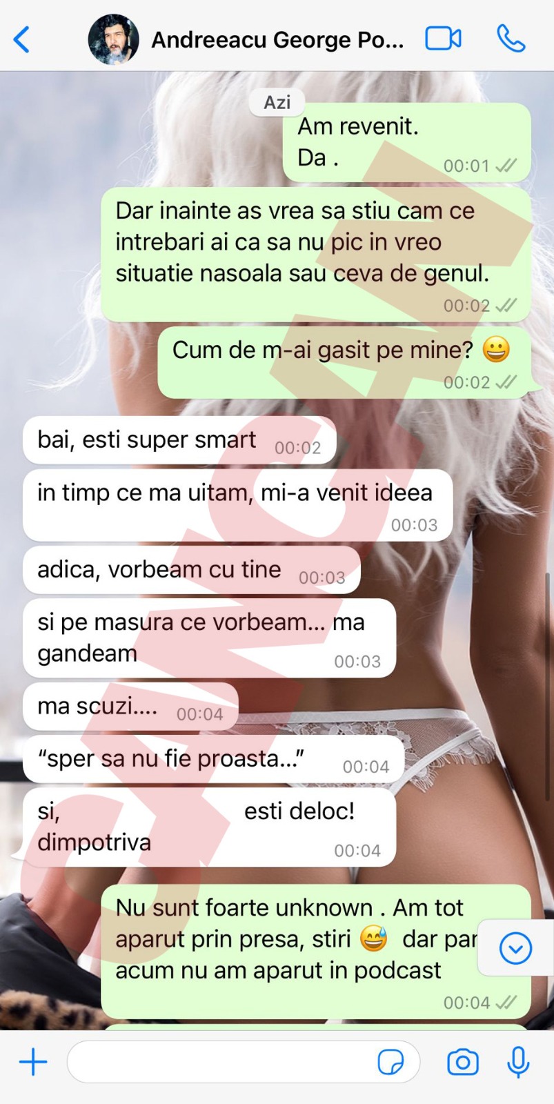 Doar că insistența bărbatului a scos-o din sărite: „Mi-a scris pe Facebook și i-am răspuns la mișto. I-am dat unui prieten screenshot și mi-a zis că are podcast.