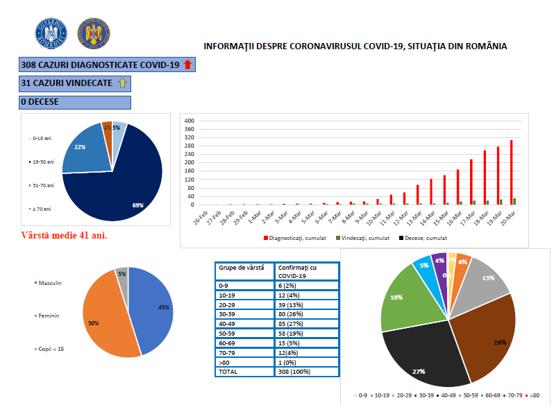 Potrivit Grupului de Comunicare Strategică, până vineri, 20 martie, ora 13:00, pe teritoriul României, au fost confirmate 308 cazuri de persoane infectate cu virusul COVID – 19 (coronavirus). Dintre cele 308 de persoane confirmate pozitiv, 31 au fost declarate vindecate și externate (22 la Timișoara, 8 la București și unul la Iași).